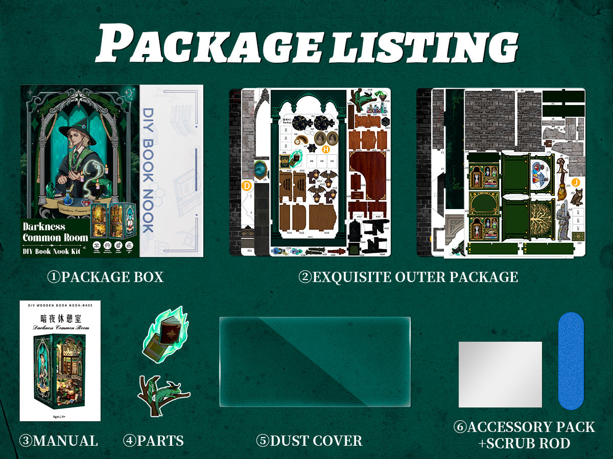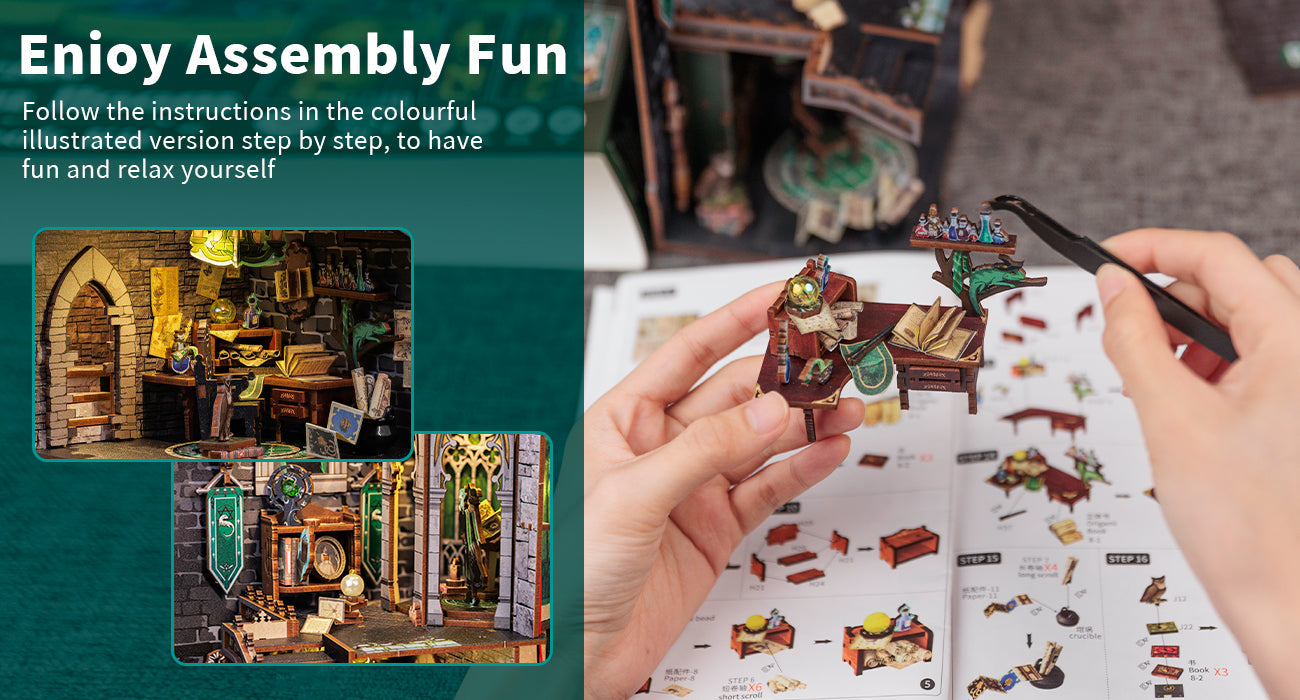 This Book Nook Magic Laboratory comes with pieces to be assembled by yourself. Even if you are a beginner at this, the colorful manual will clearly guide you step by step to complete this magical kit.