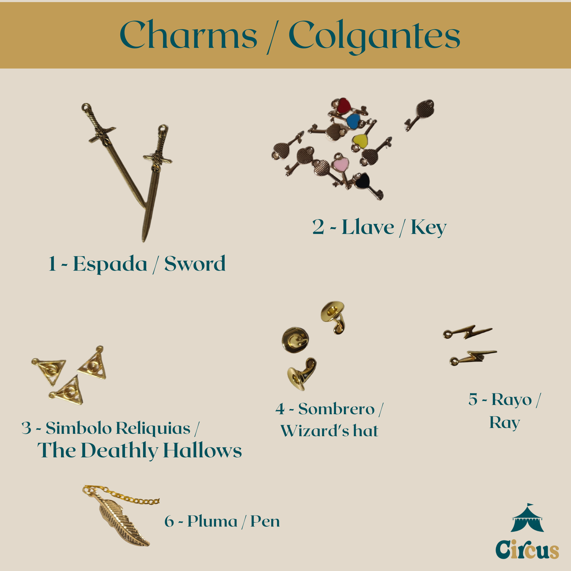 • 1 libro y un charm de sombrero: Un mini libro de 2 cm aproximadamente que aporta elegancia y sencillez y un charm dorado del sombrero de mago... o quizás es el sombrero seleccionador!