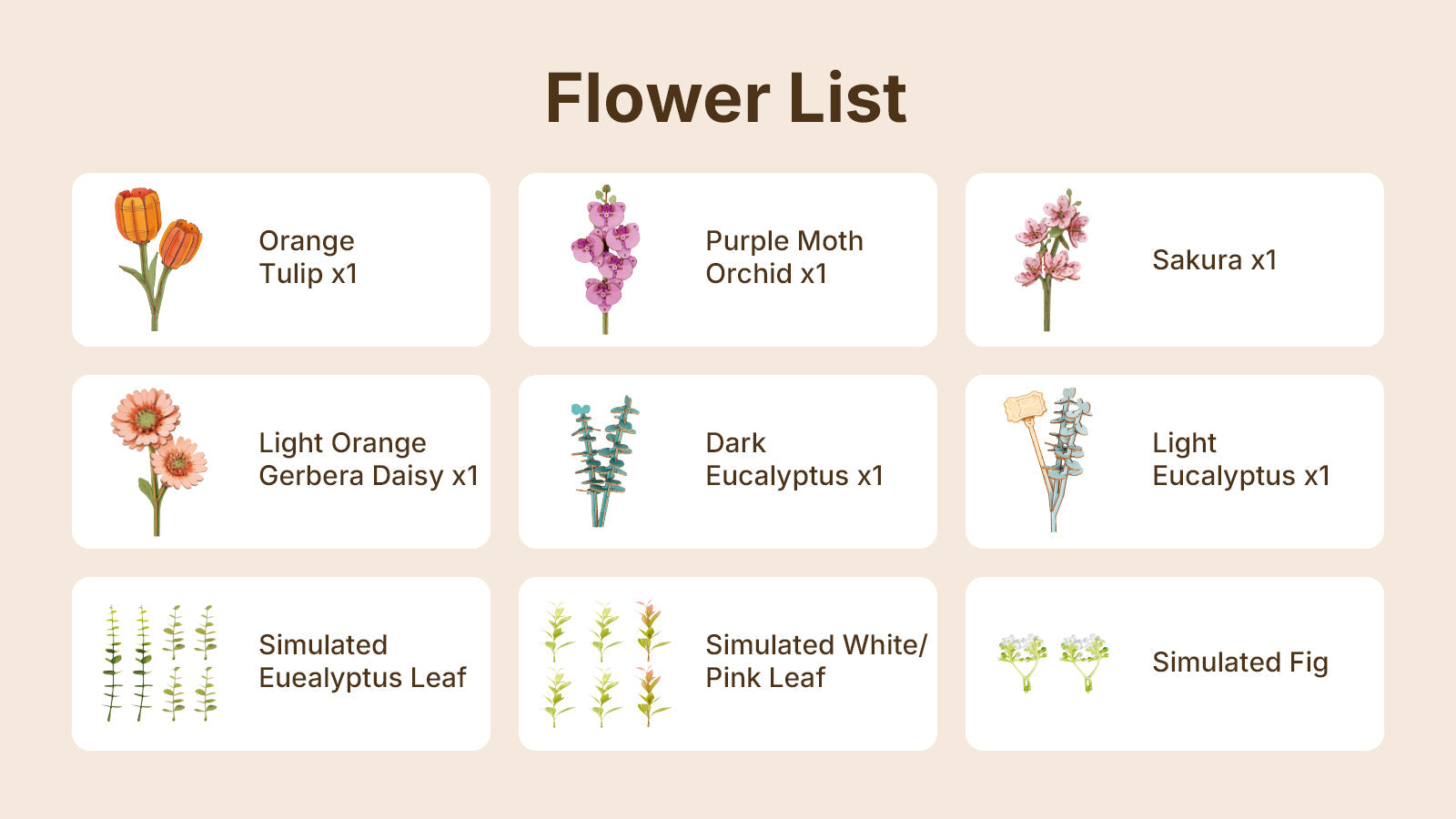 Dentro de las páginas de este libro encontrarás 9 tipos diferentes de flores, como tulipanes, rosas, margaritas, orquídeas, camelias, hortensias, cerezos, claveles y hojas de eucalipto. Cada una con su propio significado: amor, esperanza, gratitud, dulzura y alegría.