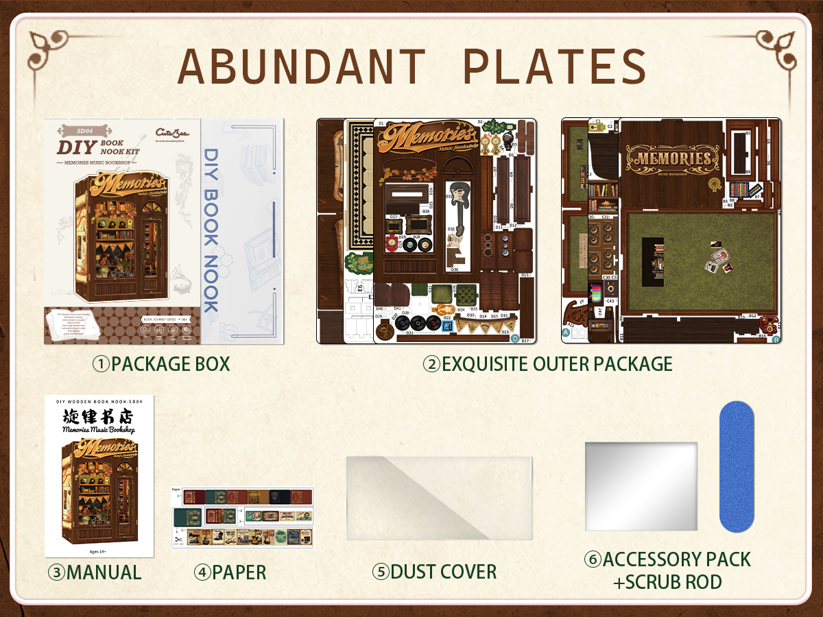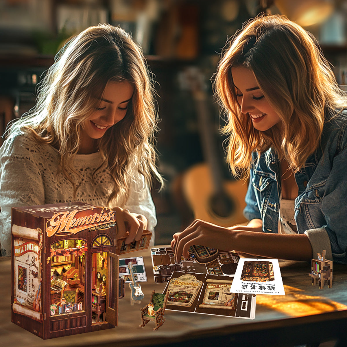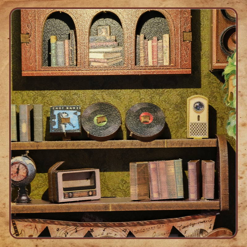 Sumérgete en la perfecta armonía entre la música y la lectura con este Book Nook DIY en miniatura. Inspirado en una encantadora librería vintage, este diorama de madera recrea un rincón lleno de partituras, libros y detalles mágicos que capturan la esencia de un músico apasionado por las historias.